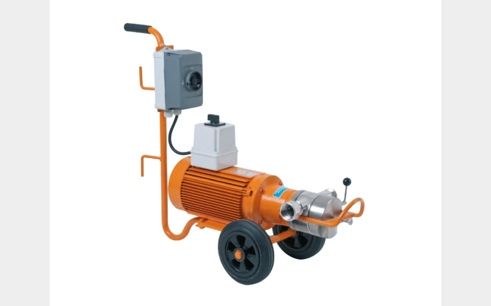Sur chariot, avec bypass, inverseur de marche, revêtement intérieur en acier inox, palier intermédiaire de l’arbre de pompe de très haute qualité, avec disjoncteur de moteur.