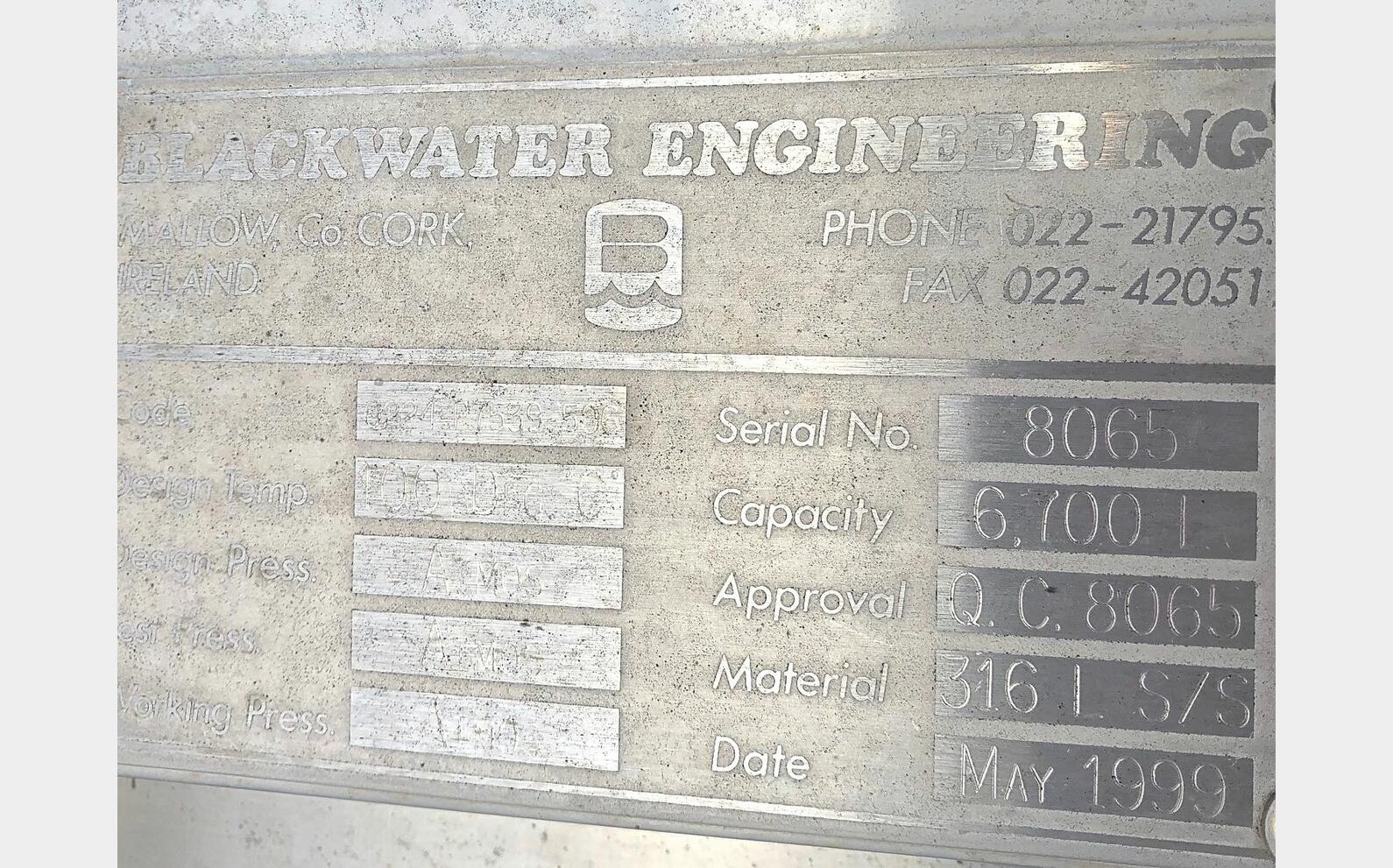 Cuve inox 316L agitée - Volume : 6700 litres - 006246