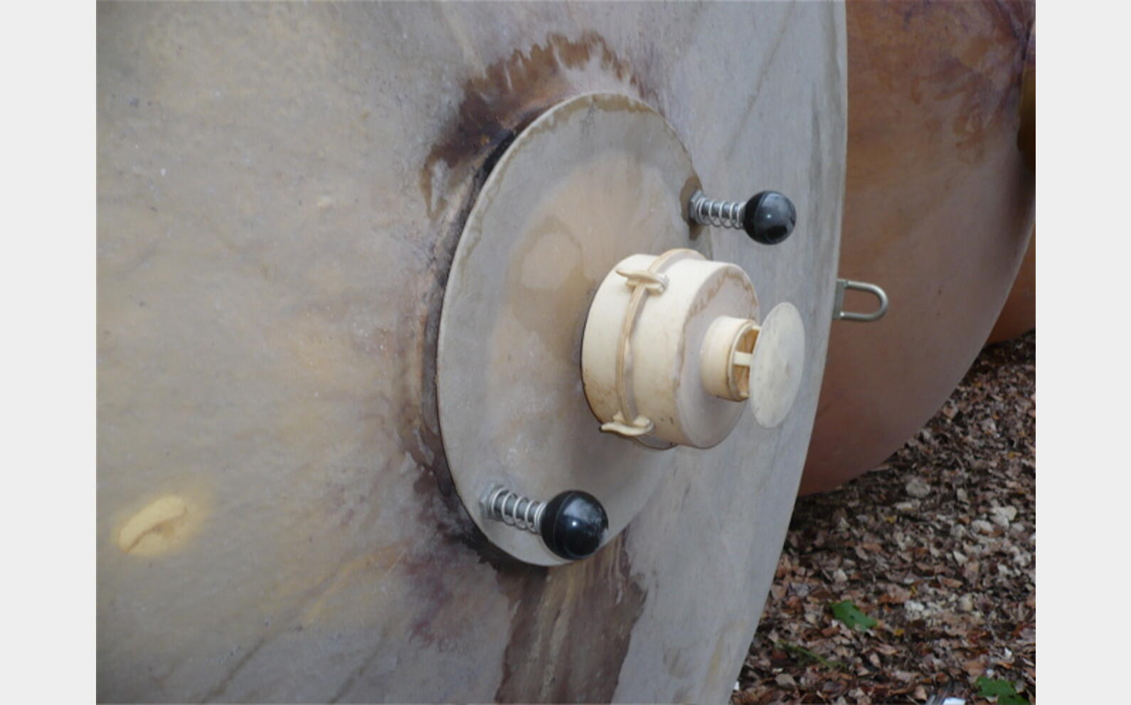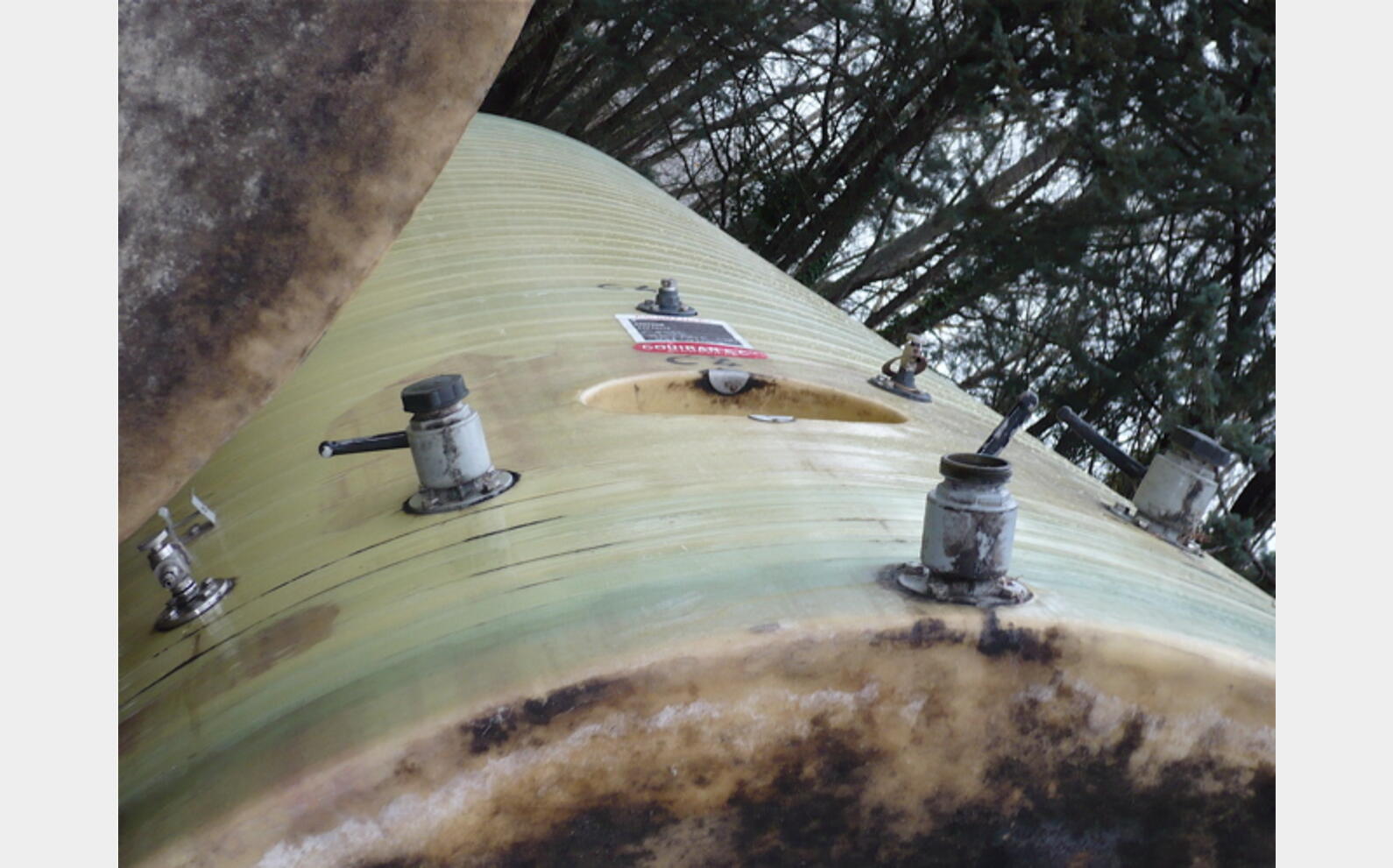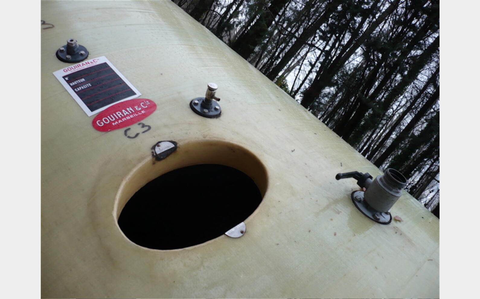 CARACTERISTIQUES TECHNIQUES : - cylindrique verticale à fond bombé - boitard intérieur de vidange totale - trou d'homme sur le dome - trou d'homme en bas de virole - provenance : agroalimentaire (vin rouge) DIMENSIONS : - hauteur 5900 mm - diamètre 2600 mm