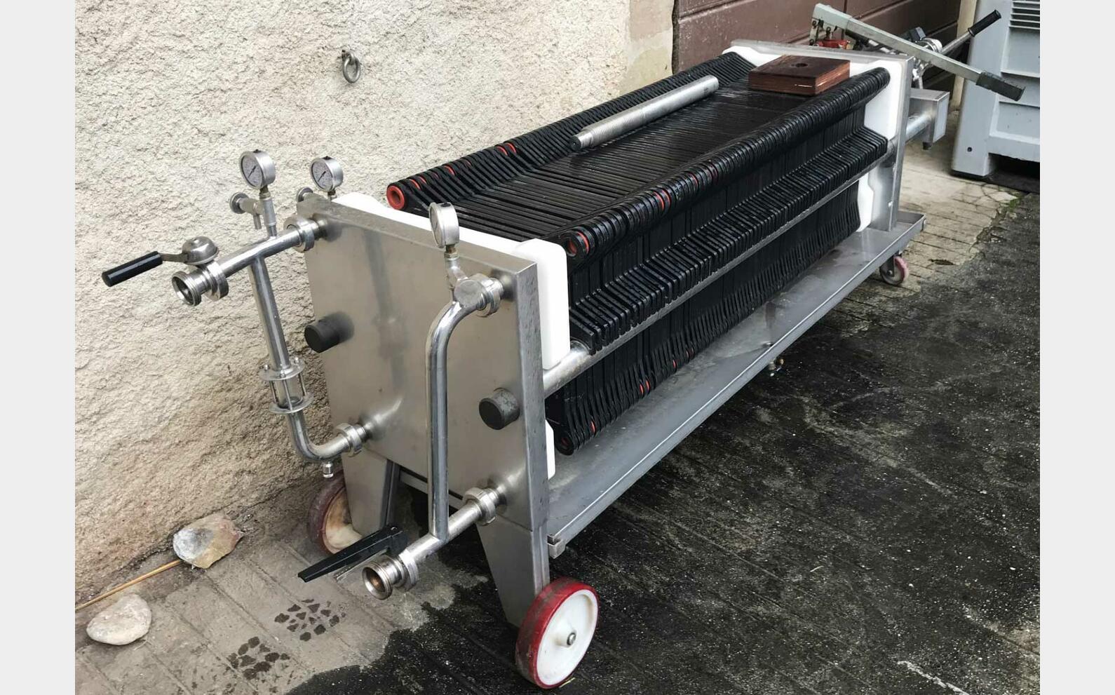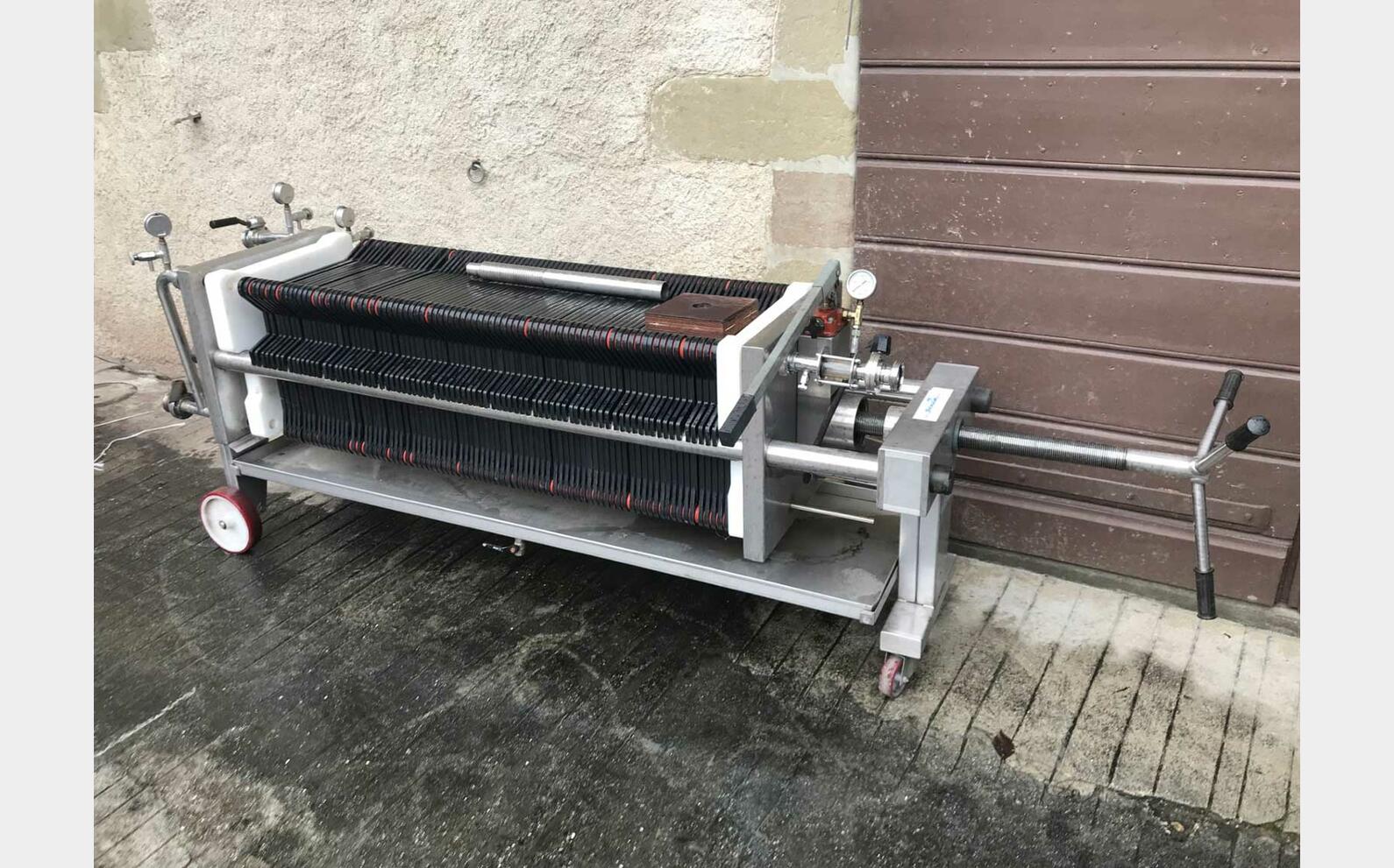 Ce filtre à plaques SFOGGIATECH est conçu pour la filtration des liquides en environnement vinicole et agroalimentaire. Sa configuration, associée à 80 plaques au format 40 x 40, à une chambre de renversement et à une rallonge permettant de diminuer le nombre de plaques, en fait une solution d’occasion robuste et immédiatement exploitable pour les opérations de filtration en cave.